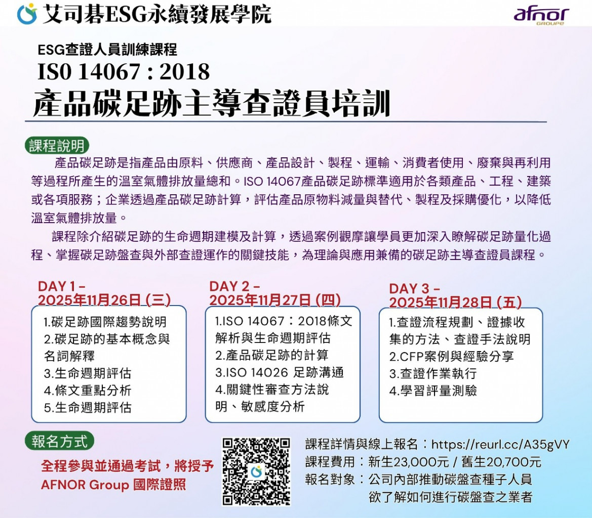 *課程內容 : 產品碳足跡是指產品由原料、供應商、產品設計、製程、運輸、消費者使用、廢棄與再利用等過程所產生的溫室氣體排放量總和。課程除介紹碳足跡的生命週期建模及計算,透過案例觀摩讓學員更加深入瞭解碳足跡量化過程、掌握碳足跡盤查與外部查證運作的關鍵技能,為理論與應用兼備的碳足跡主導查證員課程。